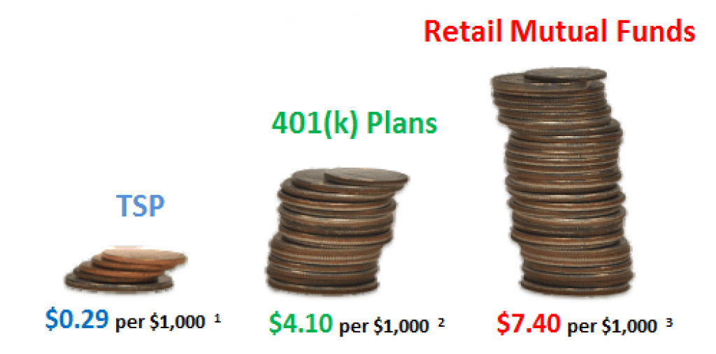 The TSP offers incredible cost savings as it is dramatically cheaper than the average expense ratio of traditional mutual funds. In 2015, the TSP had a net expense ratio of only 0.029% while the average expense ratio of the civilian TSP equivalent of a 401(k) and average mutual funds are much more expensive! That means that if your TSP balance is $1,000, you are only paying about $0.29 a year in fees while that same $1,000 in an average 401(k) would cost you $4.10 a year or even $7.40 inside an average mutual fund.