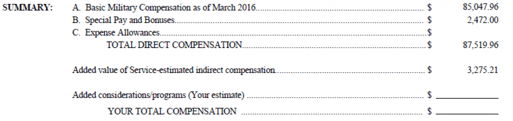 DFAS pre-fills in your basic pay, special pay and bonuses, expense allowances (OHA, COLA, etc.), as well as an estimate of the added value of indirect compensation which is usually based on the federal tax advantage of BAH and BAS. This provides the starting point for you to add in some personal analysis about all the indirect compensation and add your estimate back in at the end to get your total compensation figure.