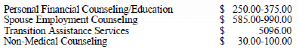The PSMC helps provide some figures here ranging from $30 an appointment up to more than $5,000 for transition assistance services to help you analyze the costs for free personal financial management counseling, relocation services assistance, transition counseling, spouse employment consultation, and assistance from a wide range of services available from their services’ community centers.