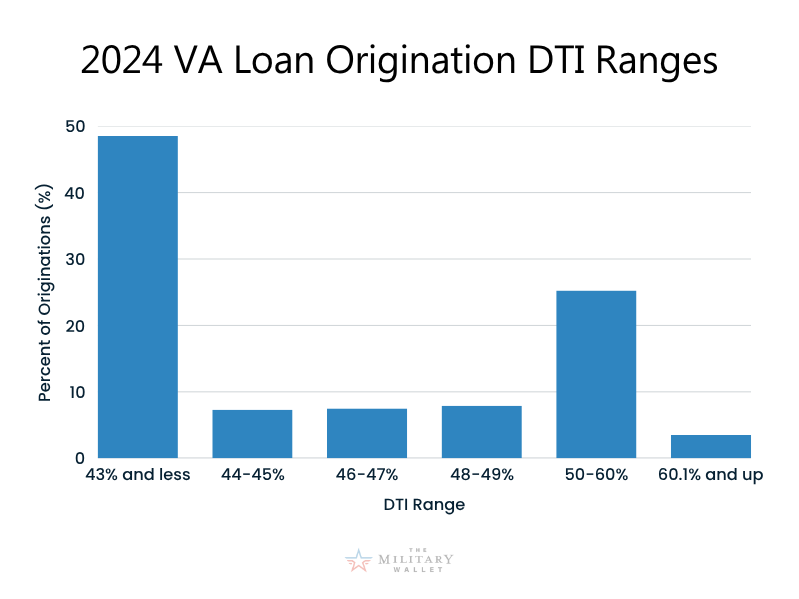 According to HMDA data, 49% of VA home loan originations in 2024 were for borrowers with a DTI ratio of 43% or less: